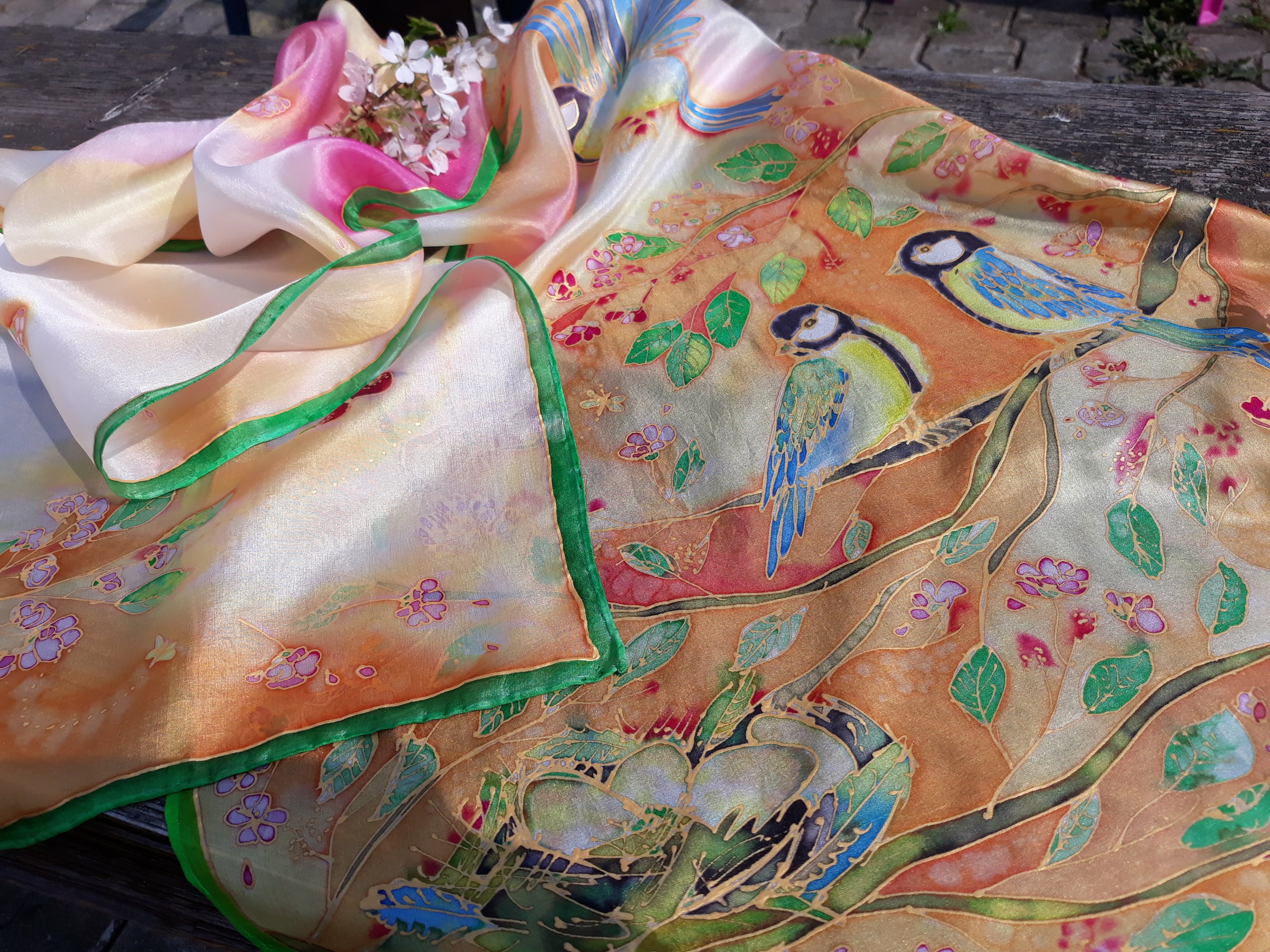 Technik malování na hedvábí je mnoho a každý si může vymyslet i svou vlastní. Nejčastěji se maluje tak, že si daný motiv předkreslíte na hedvábí fantom fixem a poté vše obtáhnete guttou. Po zaschnutí gutty (cca 2 hodiny), můžete jednotlivé plochy vybarvovat vodovými barvami a štětcem. Doporučuji si kolem lemu hedvábí nakreslit guttou okraj, protože začištěný okraj hedvábí saje více barvy.