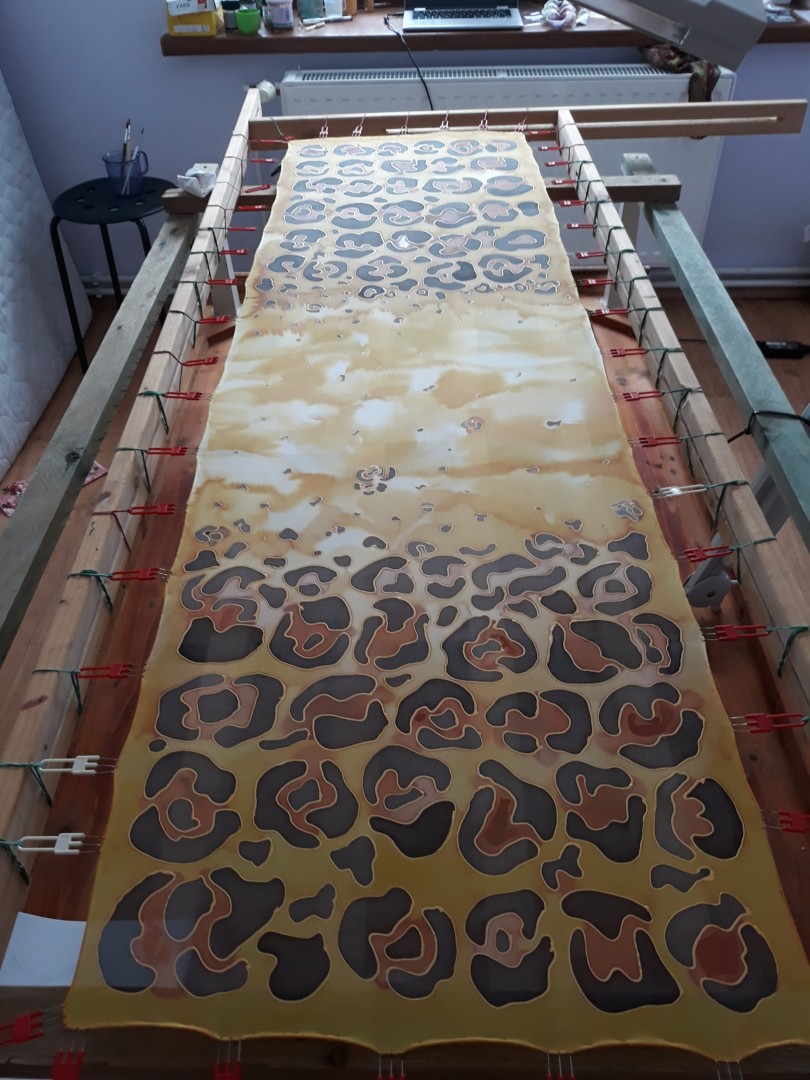 Tento šál byl vyroben zažehlovacími barvami. Nyní  již používám barvy, které se fixují parou. Více v "Jak maluji na hedvábí".