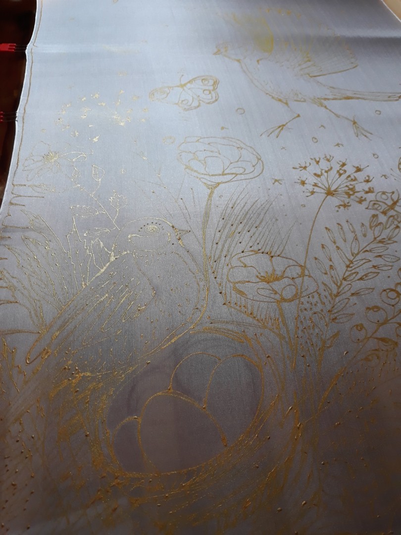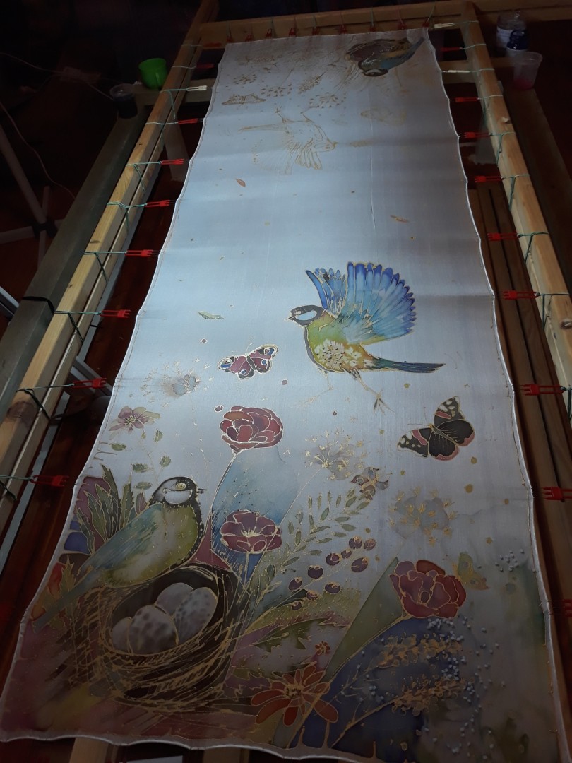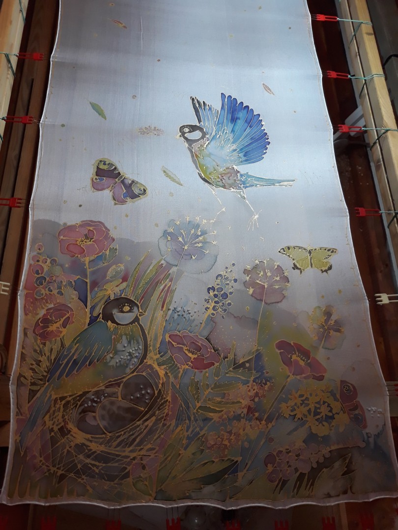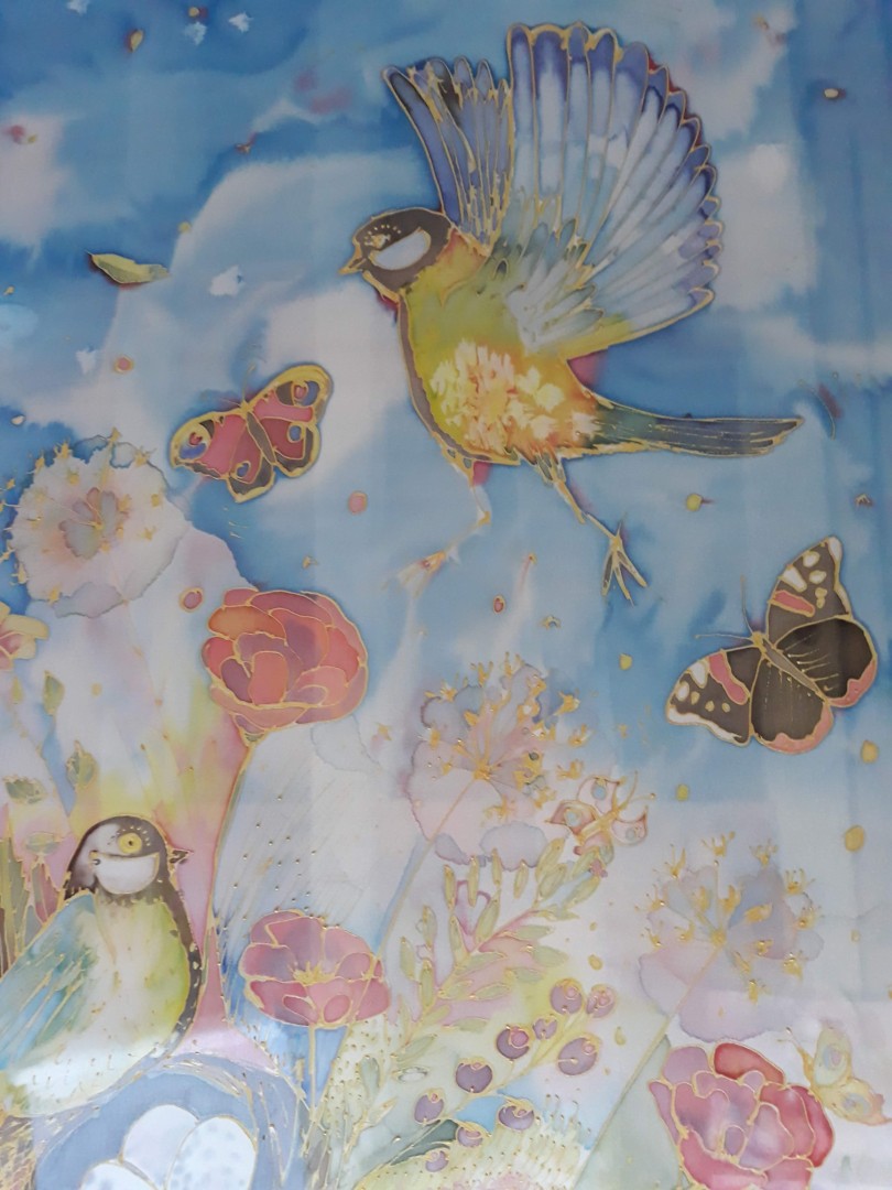 Šál vznikl v létě. Nevím, zda mohou mít sýkorky ptáčata i v létě, nicméně máme sýkorek na zahradě opravdu mnoho a jsou i celkem ochočené. Je to takový malý papoušek našich českých zahrad. Výjev, který je namalován na šálu má v divákovi navozovat pocit klidu, harmonie a lásky.