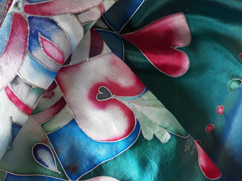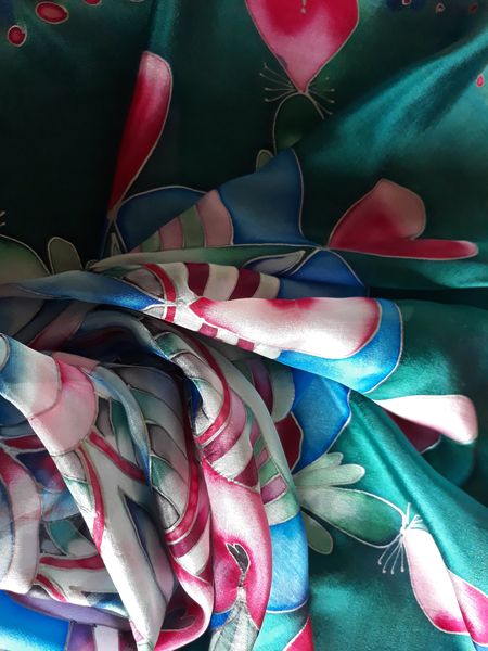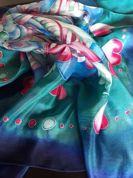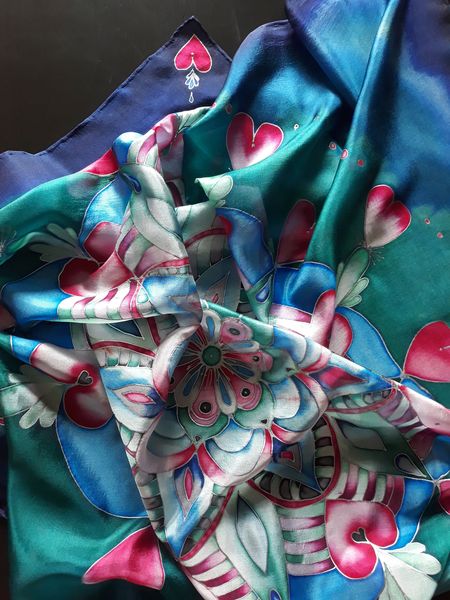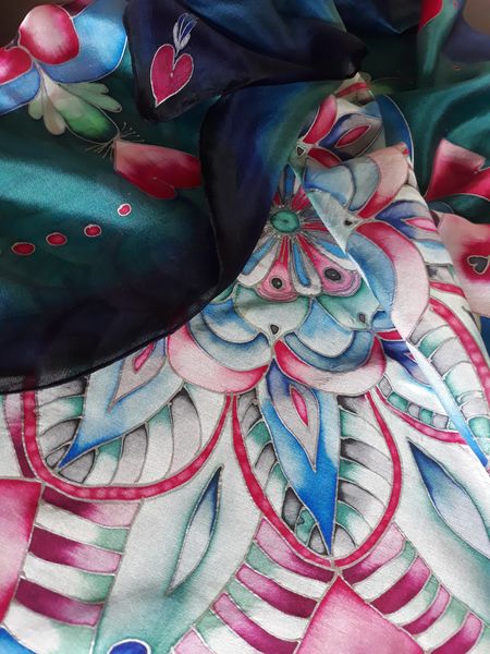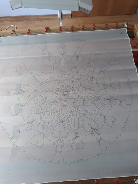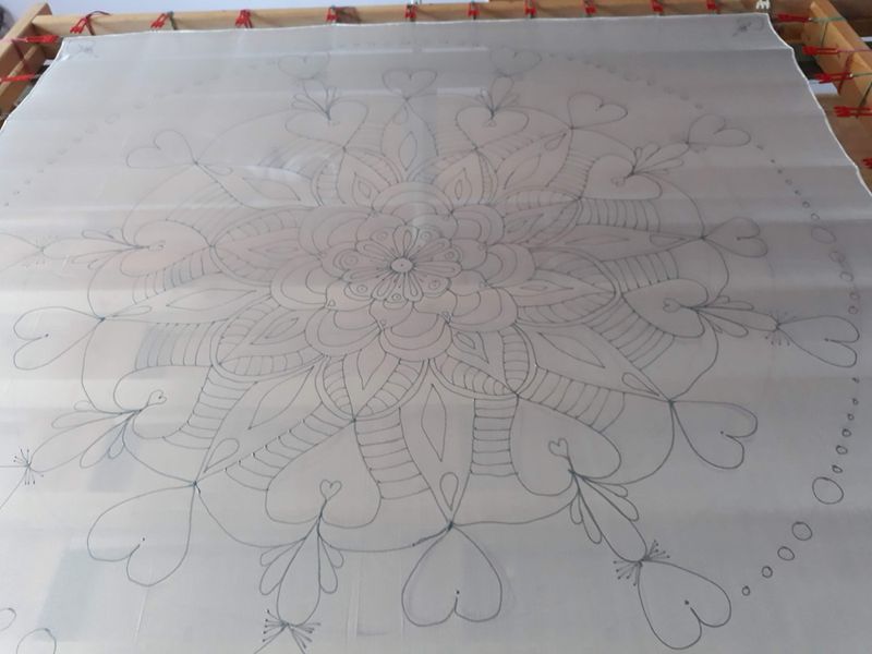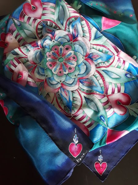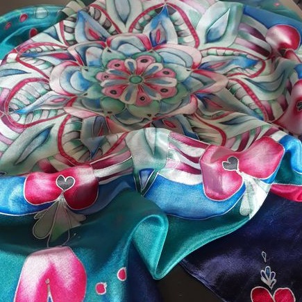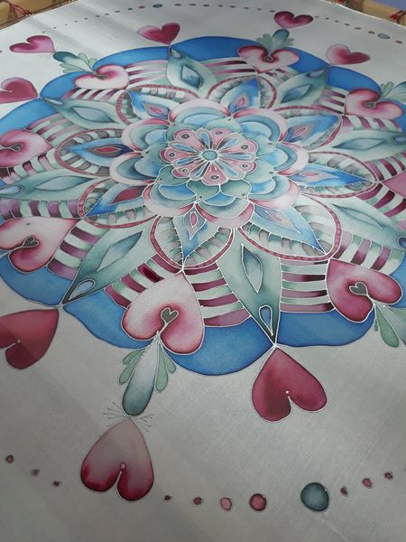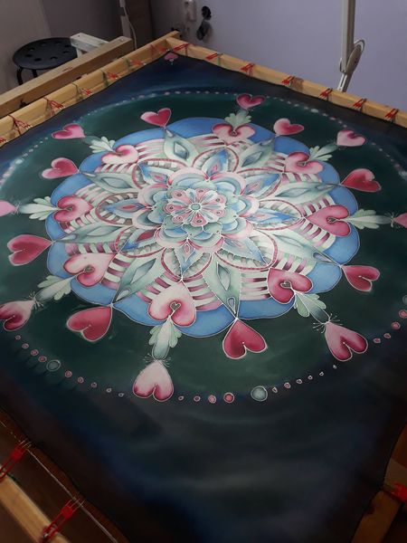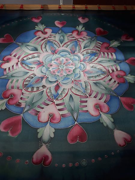 Pro svou kamarádku jsem vytvořila šátek na památku. Mám ji moc ráda a nyní ji asi dlouho neuvidím. Snažila jsem se trefit do jejích oblíbených barev a zapojit do obrazce i srdíčka. Mandaly mě začaly velmi bavit. Jejich tvorba mě uklidňuje a hlavně vypadají pokaždé krásně.