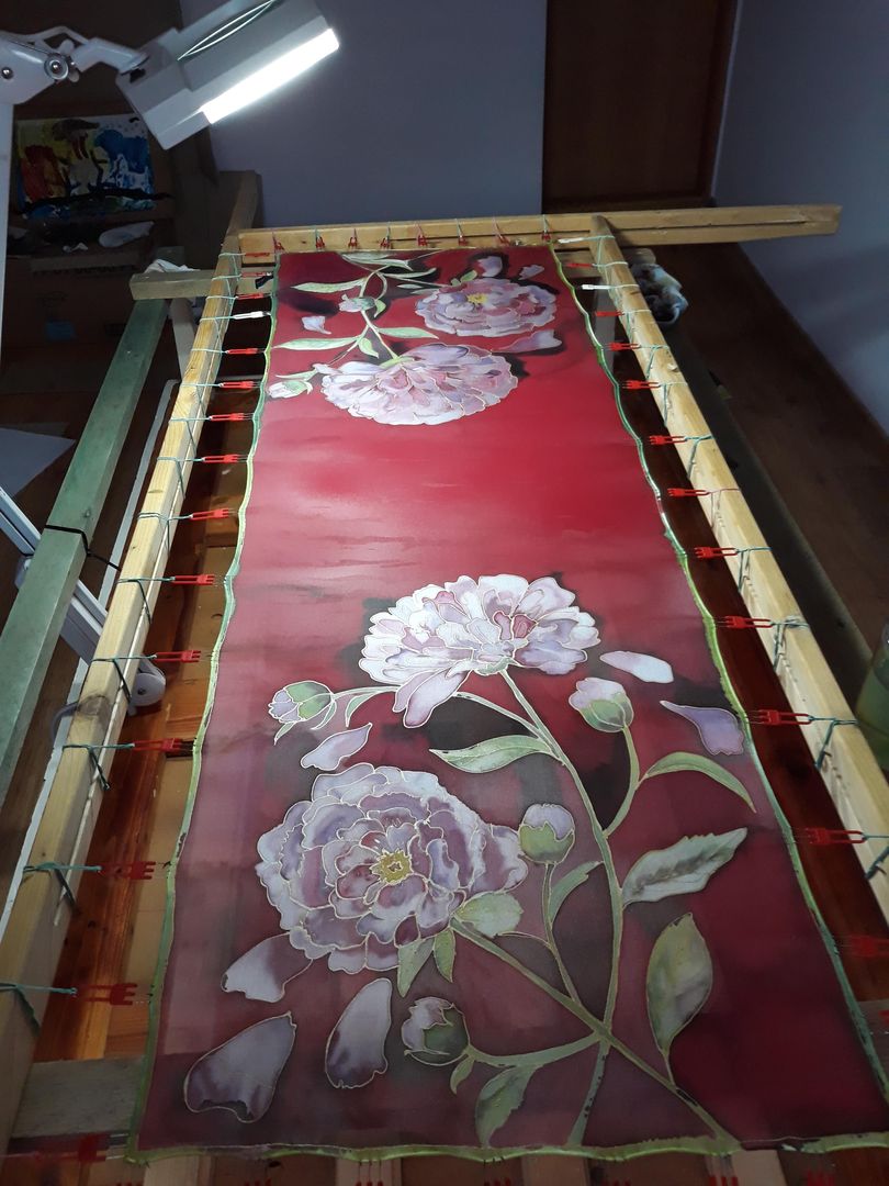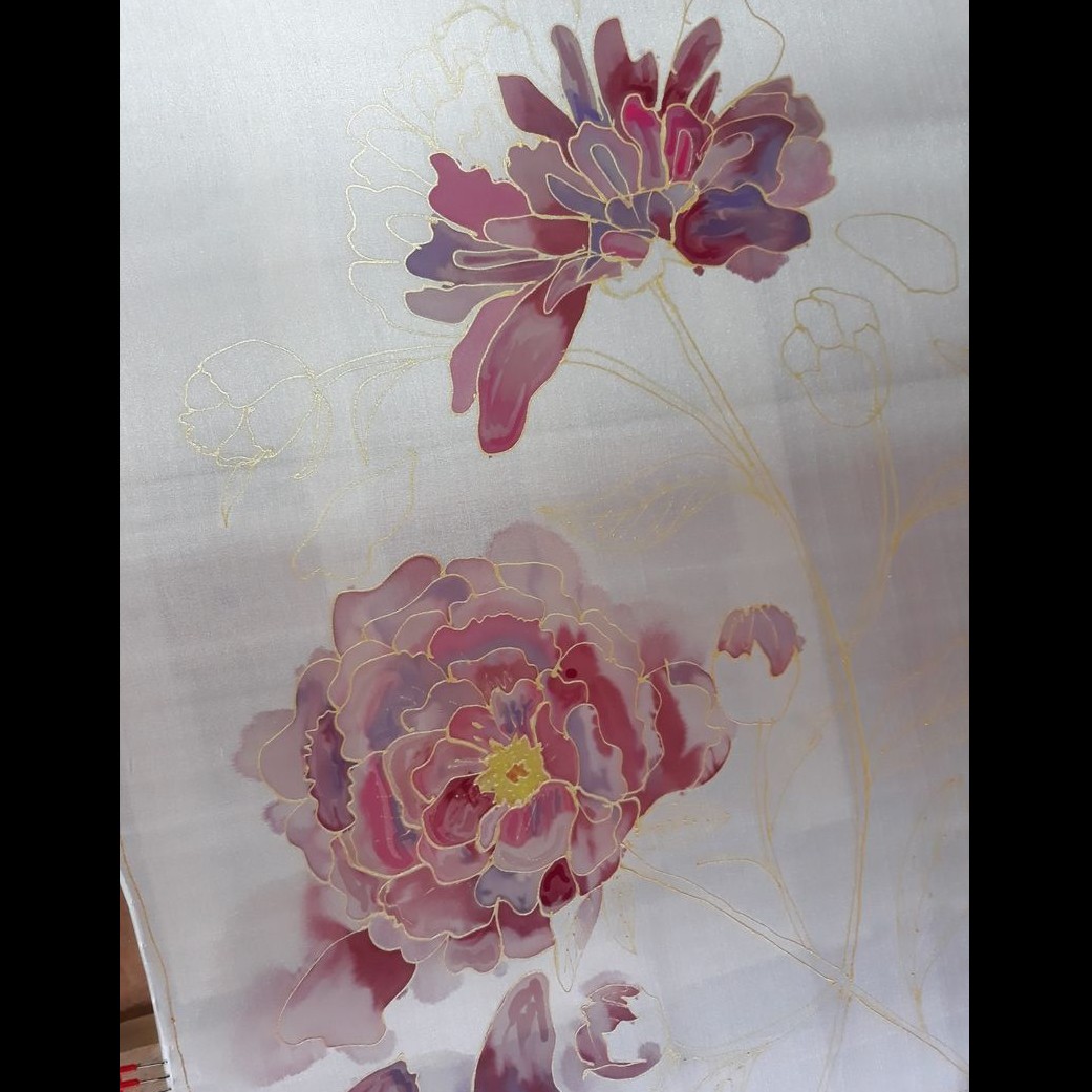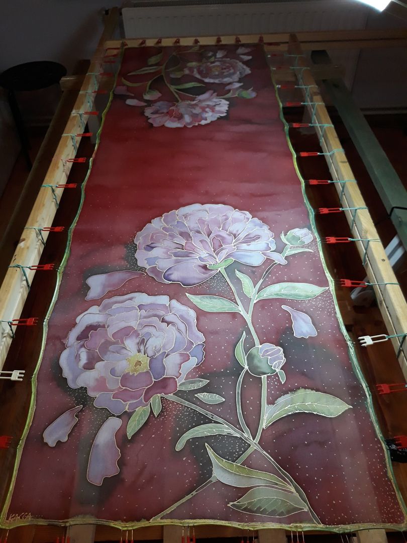Tento šál byl vyroben zažehlovacími barvami. Nyní již používám barvy, které se fixují parou. Více v "Jak maluji na hedvábí".