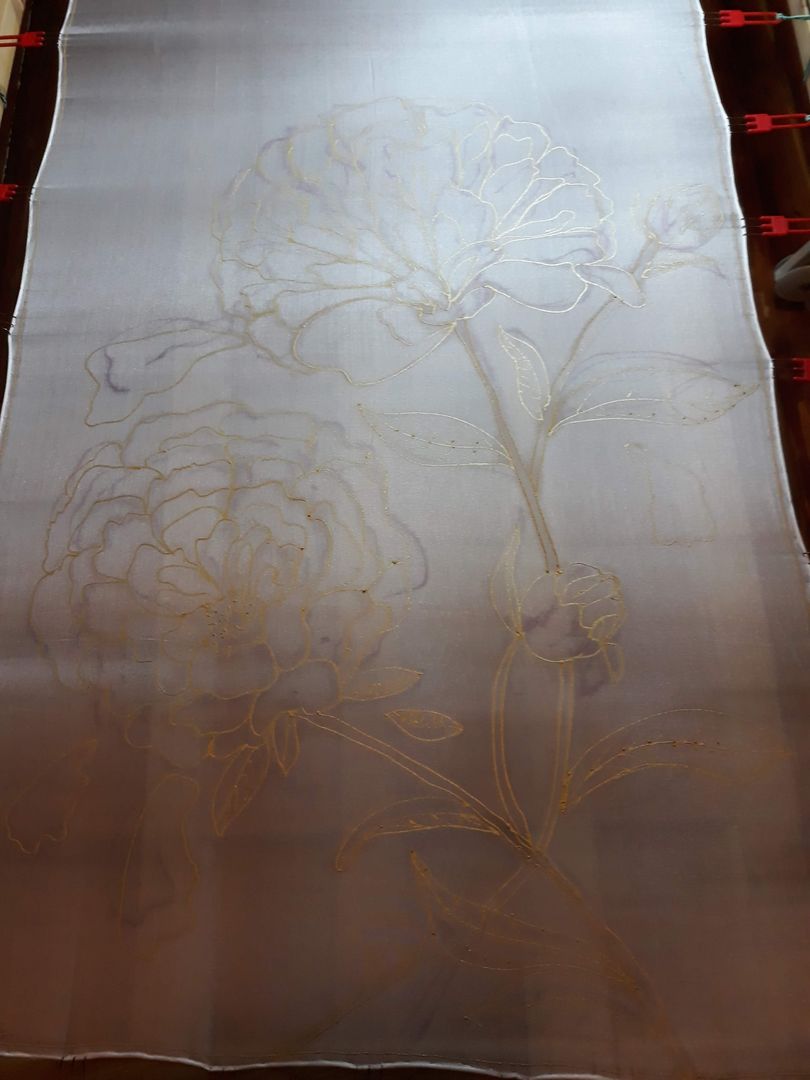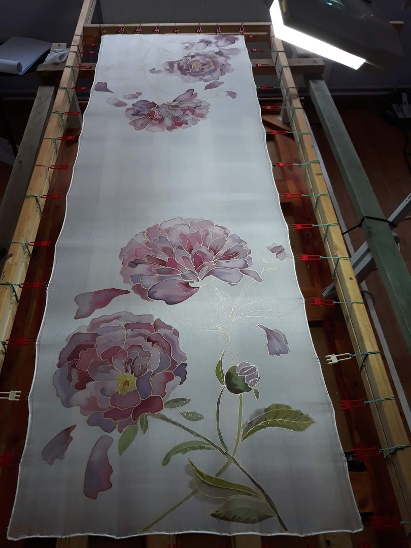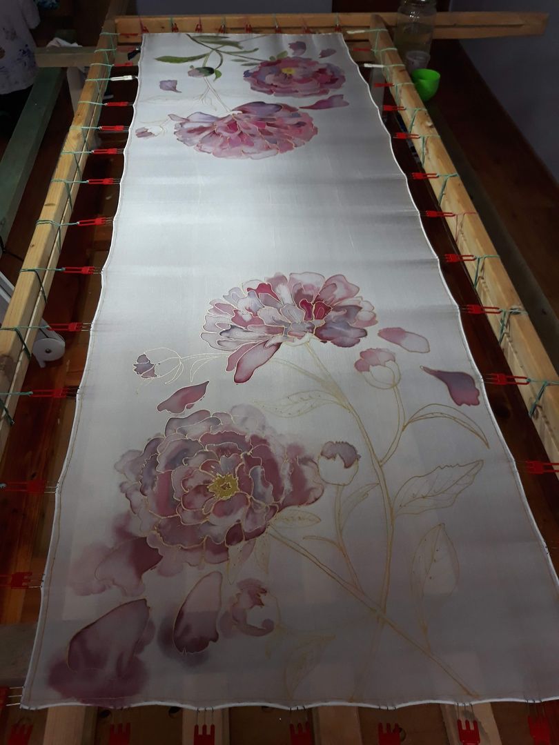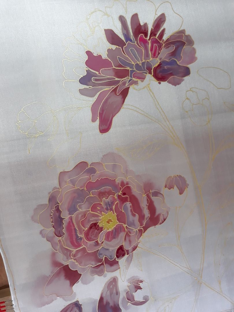 Tento šál byl vyroben zažehlovacími barvami. Nyní již používám barvy, které se fixují parou. Více v "Jak maluji na hedvábí".