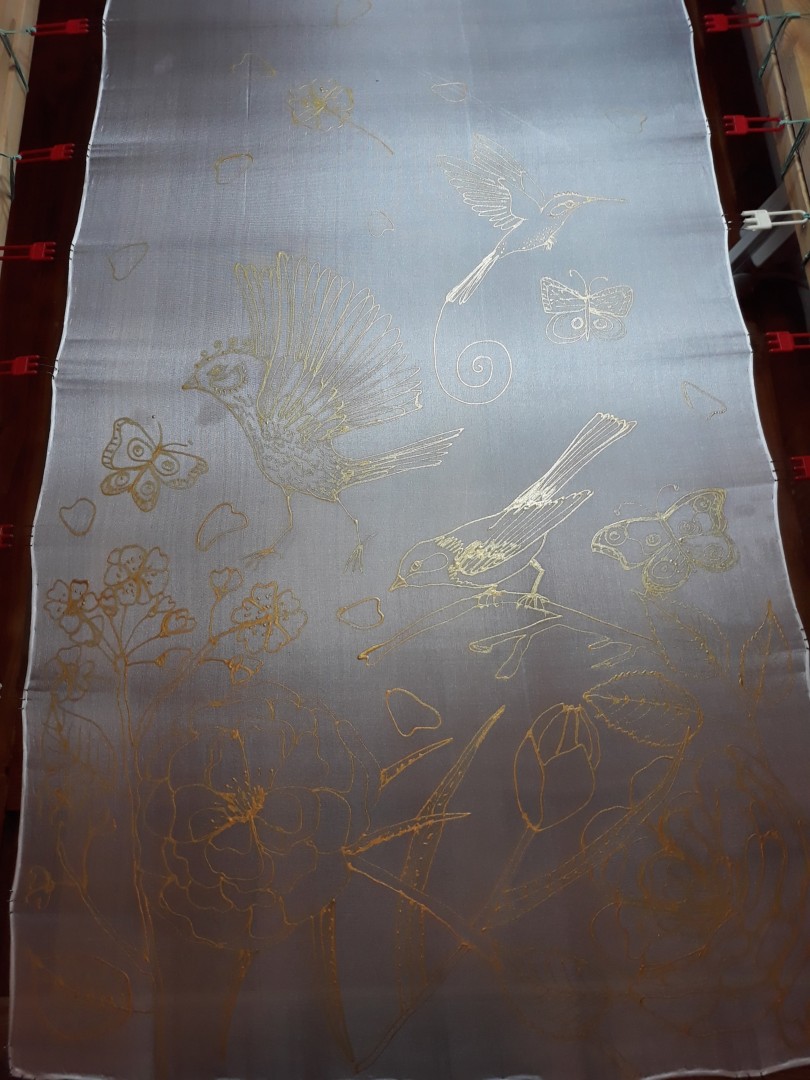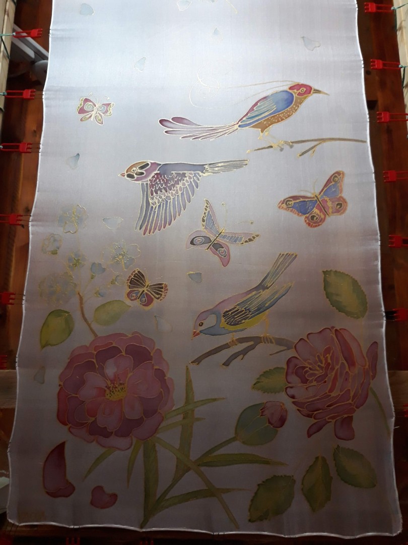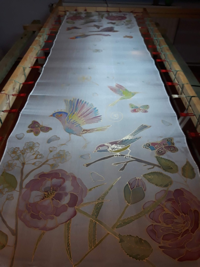 Šál jsem malovala v lednu, kdy byl všude sníh a venku mrzlo. Měla jsem potřebu vytvořit něco veselého a barevného. Je to takové těšení se na jaro.