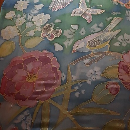 Tento šál byl vyroben zažehlovacími barvami. Nyní již používám barvy, které se fixují parou. Více v "Jak maluji na hedvábí".