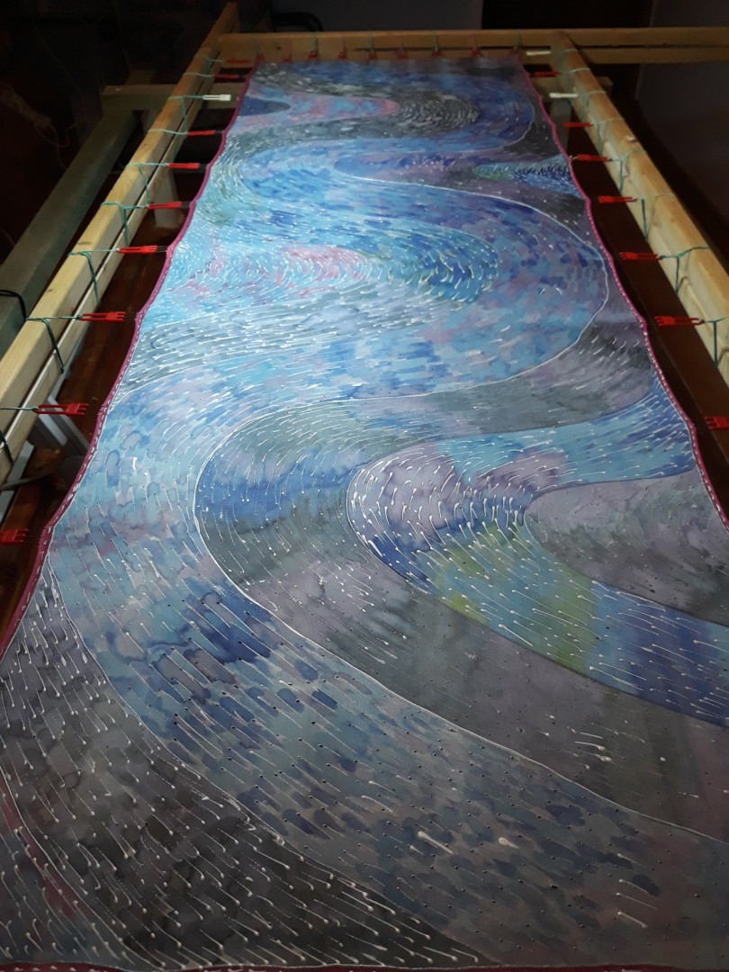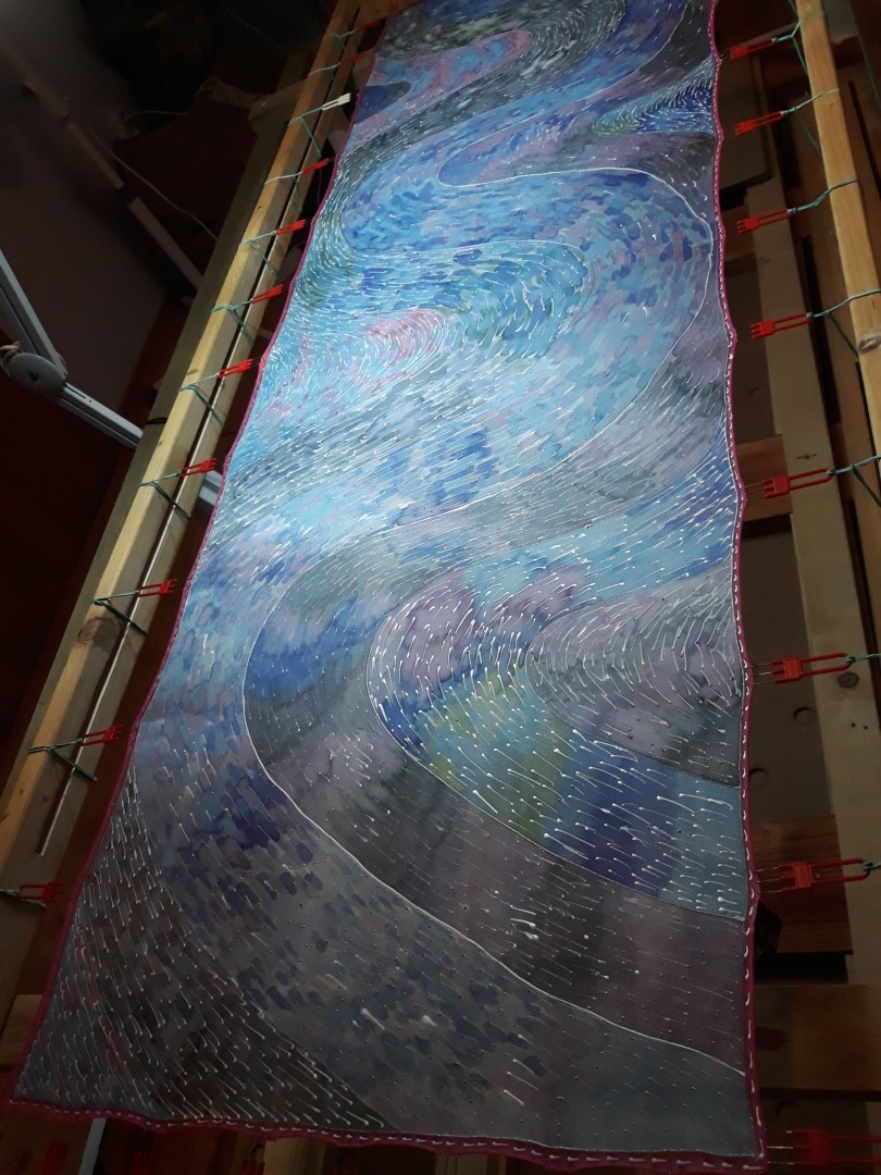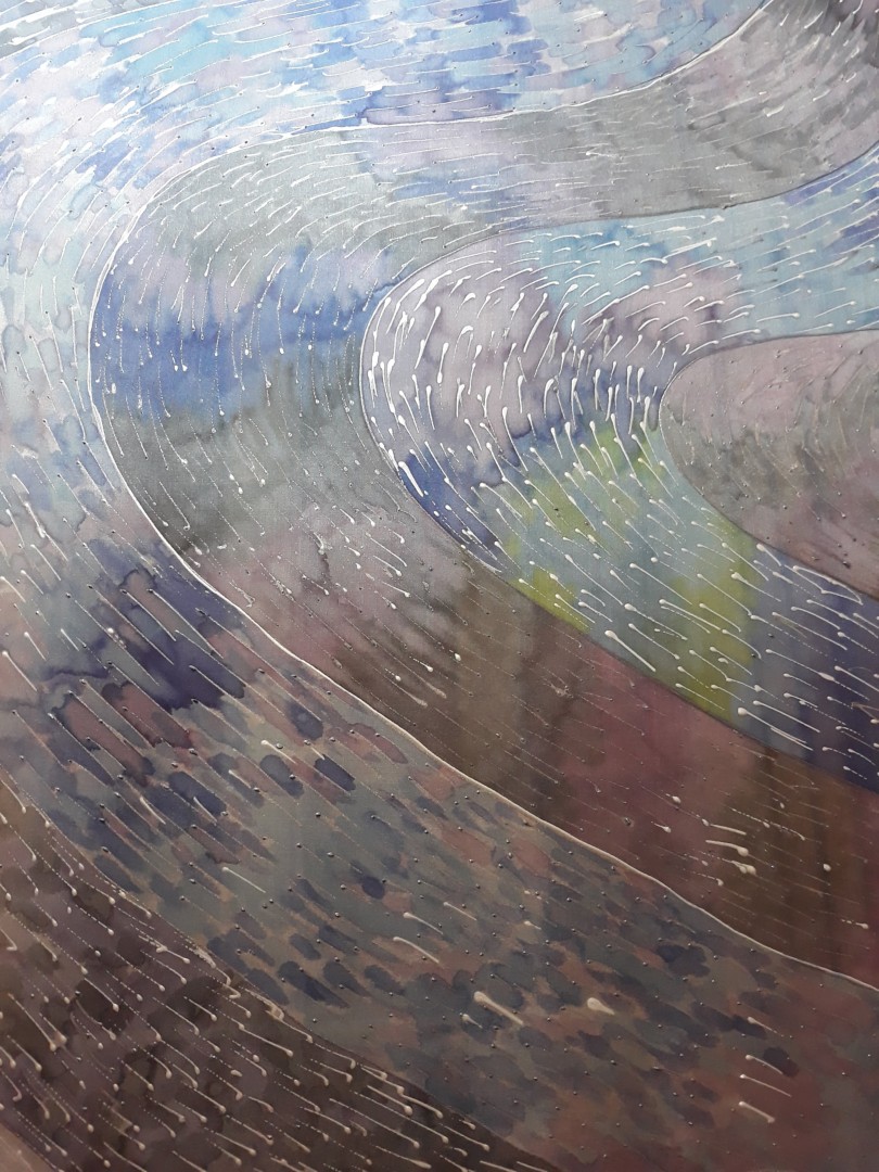 Tento šál je úplně živý. Divák má pocit, že se tam něco hýbe a vlní. Je to řeka života. Vlnící se tok energie, malé spermie, které pospíchají modrým řečištěm splnit svůj velký úkol...