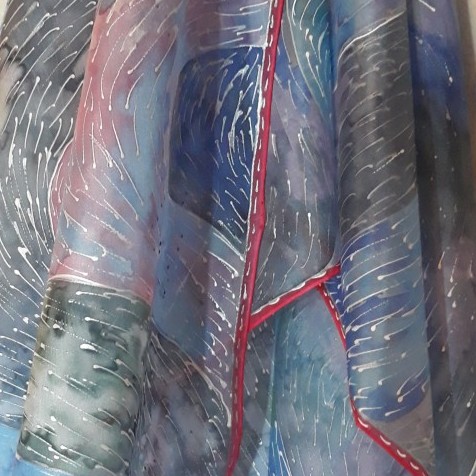 Tento šál byl vyroben zažehlovacími barvami. Nyní již používám barvy, které se fixují parou. Více v "Jak maluji na hedvábí".