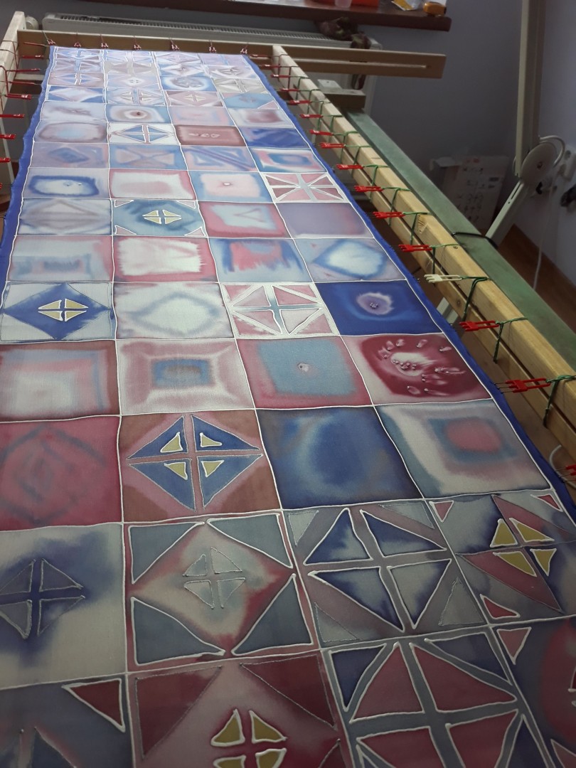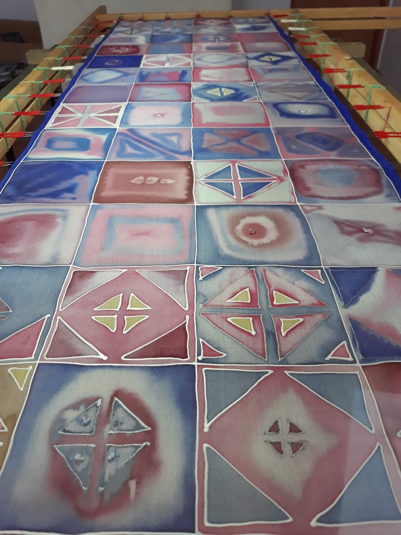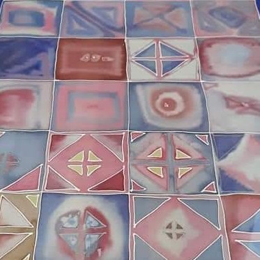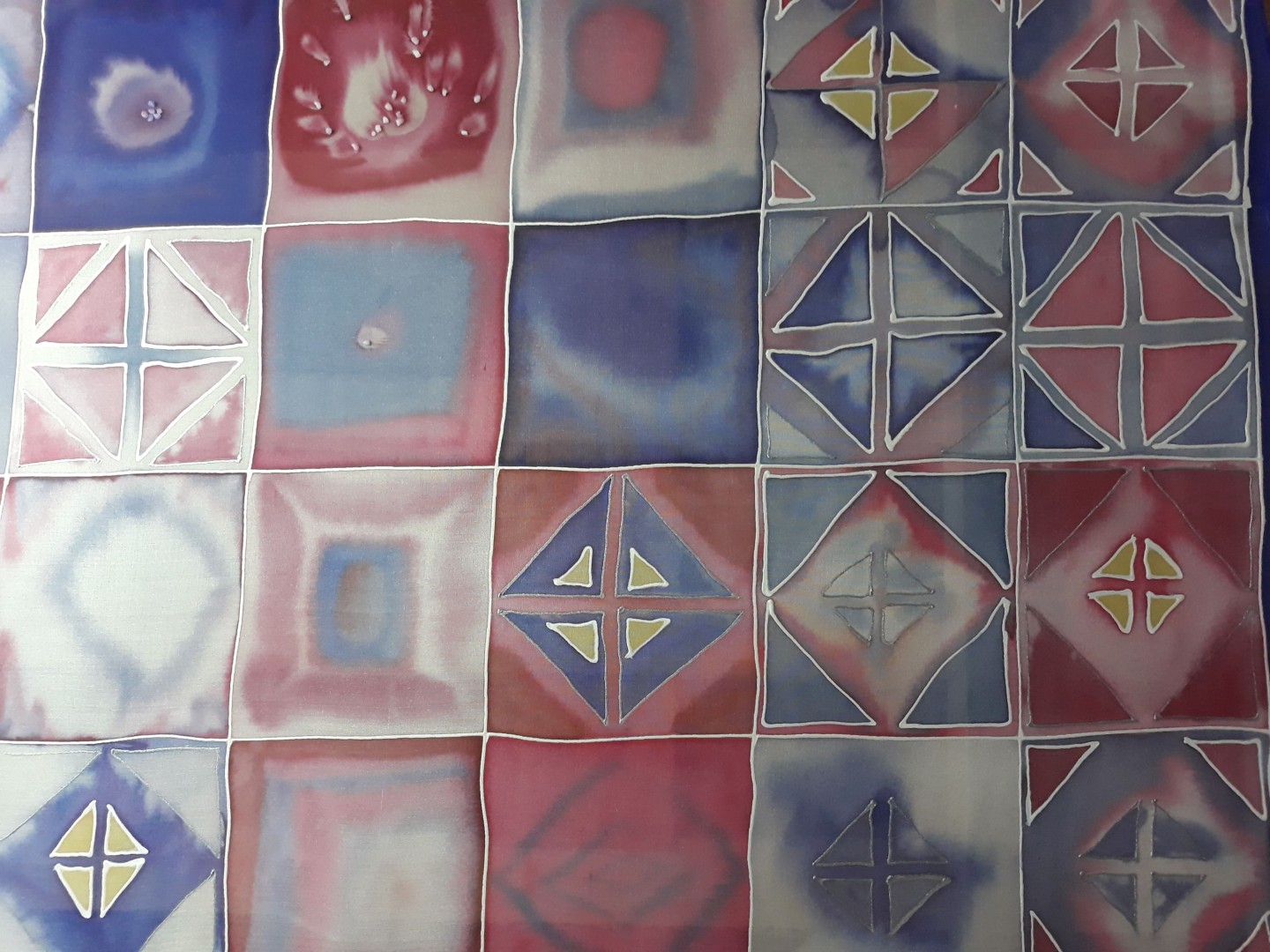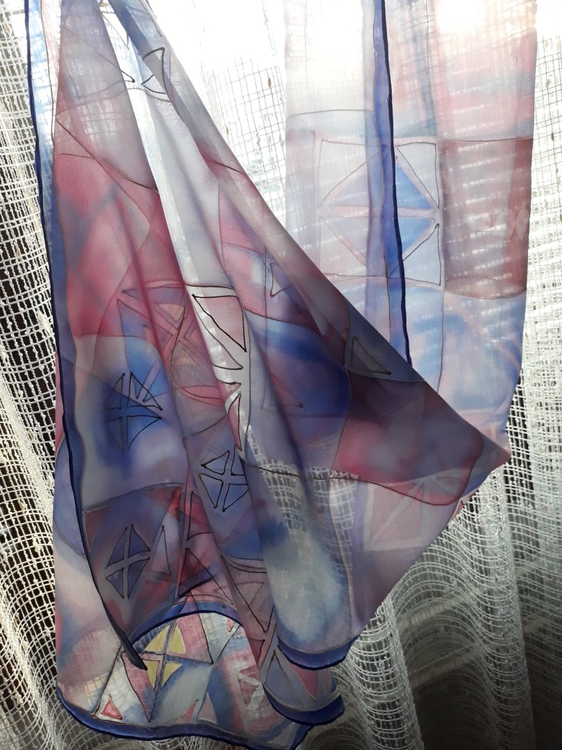 Tento šál byl vyroben zažehlovacími barvami. Nyní již používám barvy, které se fixují parou. Více v "Jak maluji na hedvábí".